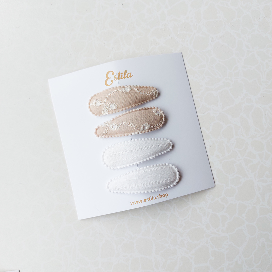 InicioClipsForrados en tela 2 pares Clips beige flores & blanco embroidery