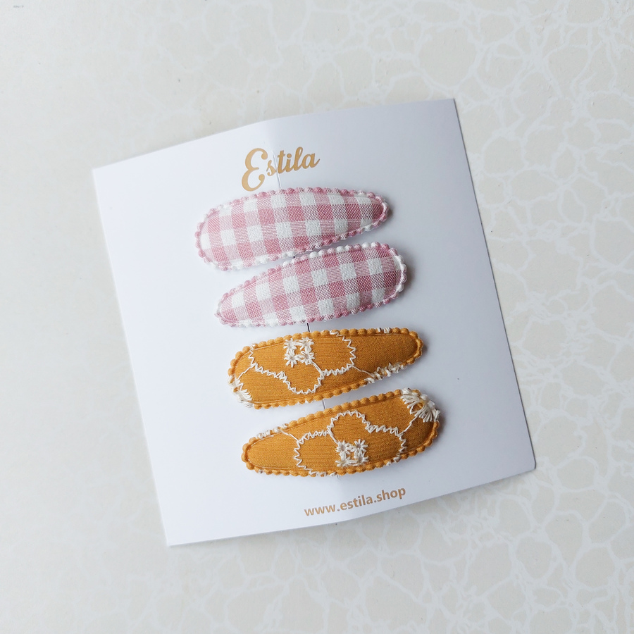 2 pares Clips cuadrillé lila & mostaza flores bordadas