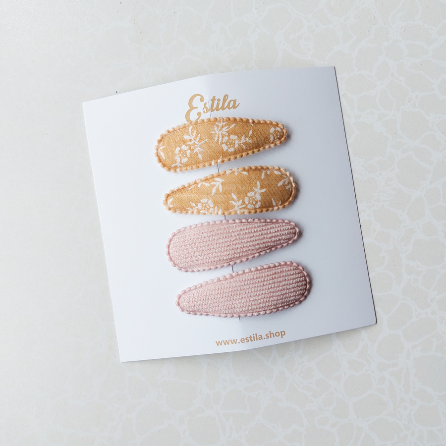 InicioClipsForrados en tela 2 pares Clips mostaza ramitas & palo rosa cotelé