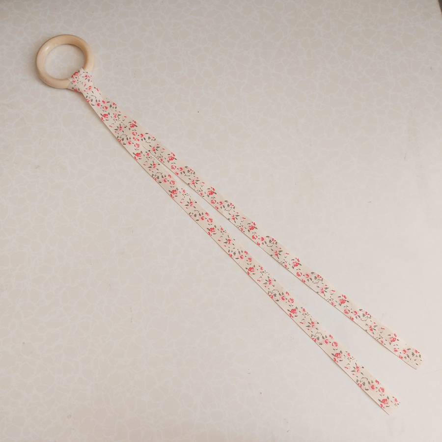 Es una argolla de madera con 2 cintas de 50cm.