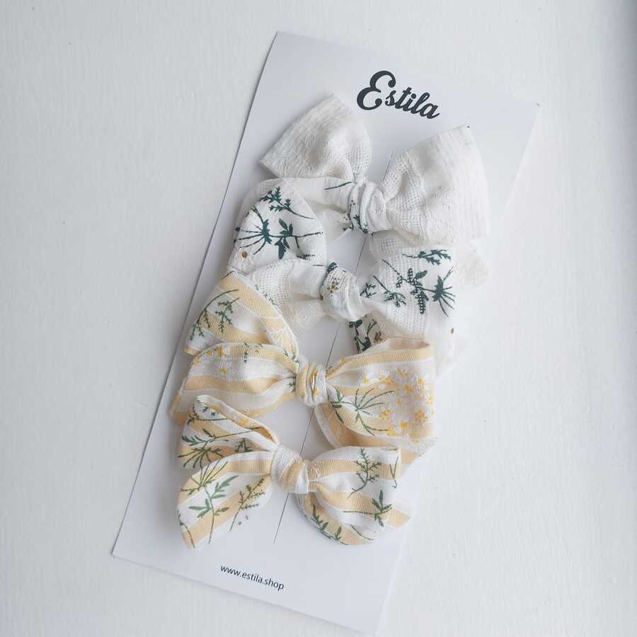 Pinzas hecha con tela de algodón. Medida lazo: 8 x 5 cm. aprox. Medida pinza: 4,5 cm.