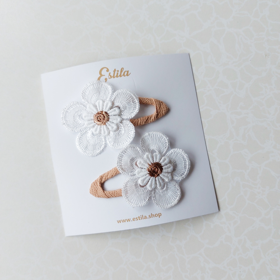 Clip metálico de 6cm, forrados con cinta y llevan una mariposa de hilo de algodón.