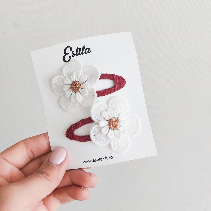 Set de 2 Clips metálicos de 5cm, forrados con cinta y llevan una flor de hilo de algodón.