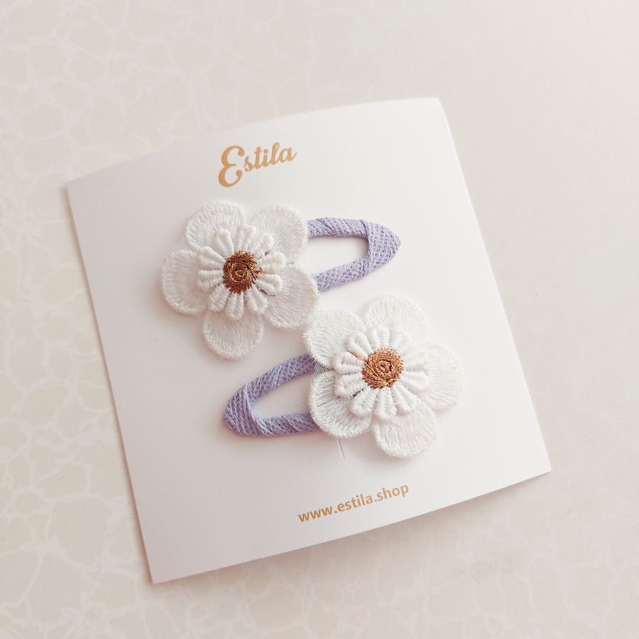 Set de 2 Clips metálicos de 5cm, forrados con cinta y llevan una flor de hilo de algodón.