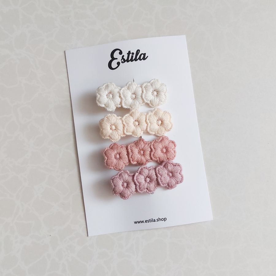 Set de 4 Pinzas hechas con flores tipo embroidery. La pinza es dorada de tipo cocodrilo de 5.5 cm.