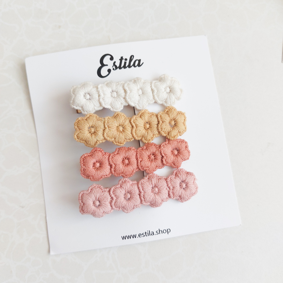Set de 3 Pinzas hechas con flores tipo embroidery. La pinza es dorada de tipo cocodrilo de 5.5 cm.